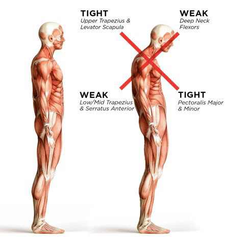 We often see forward shoulder posture as the result of our lifestyle habits such as prolonged sitting, computer usage, driving, and texting. This leads to a combination tightness of the anterior shoulder and weakness in the posterior shoulder. Correcting our posture is simple, but it is not always easy. It involves stretching the tight or limited muscles, usually the pec major, and strengthening the weak muscles, typically the lower trapezius and rhomboids. We also recommend taking frequent breaks from prolonged postures throughout the day. For example, if you work at a computer for most of the day, we recommend standing and walking for a minute at least once an hour.